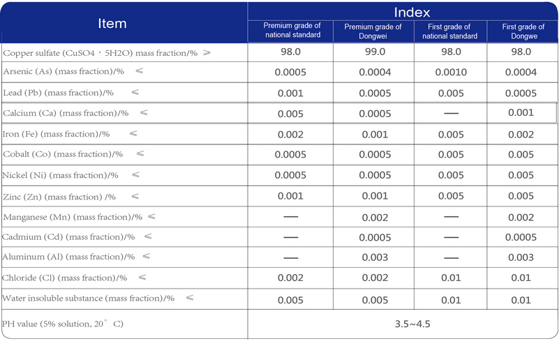 Blue crystal, odorless, specific gravity of 2.284g/cm3, soluble in water and dilute ethanol; its aqueous solution possessing weak acidity, which is slowly weathered in the dry air, with surface turning into white powder; when heated to 110°C, loses 4 crystal water molecules; and when heated to above 150°C, forms white and easily water-absorbing anhydrous cupric sulfate.