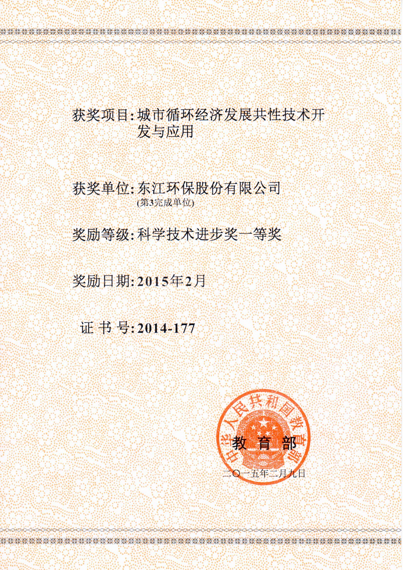 2015年2月 科學技術進步獎一等獎(城市循環經濟發展共性技術開發與應用)