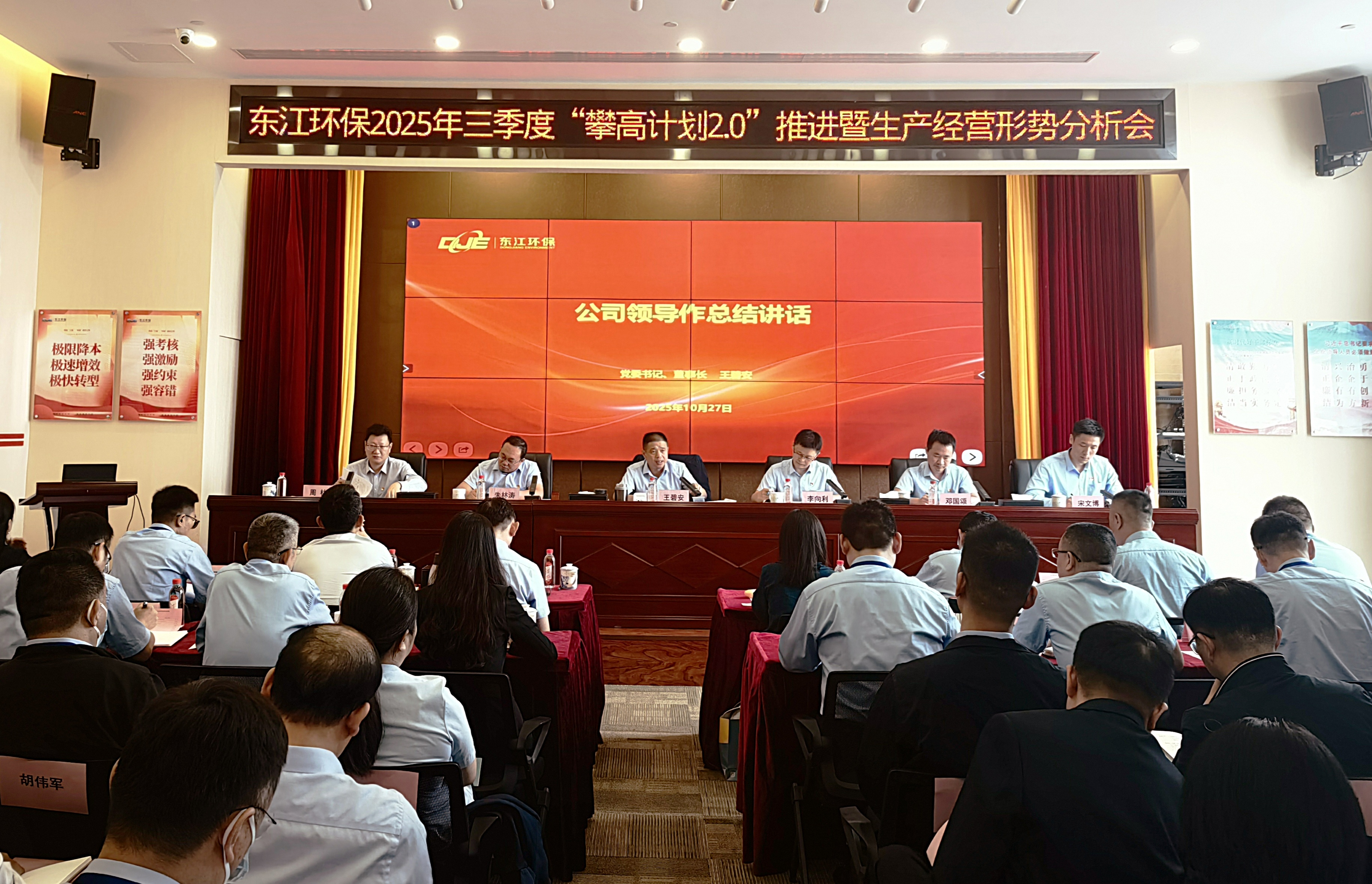 | 10月27日,東江環保召開2025年三季度“攀高計劃2.0”推進會暨生產經營形勢分析會,認真總結公司黨建工作、“攀高計劃2.0”落實情況、復盤前三季度經營工作情況,深入研判形勢,剖析問題,部署下一階段重點工作。廣晟控股集團企業管理部副部長蔣澤澤視頻參會。公司黨委書記、董事長王碧安主持會議并講話,黨委副書記、董事、總裁李向利總結公司前三季度生產經營工作并部署四季度重點工作,領導班子成員朱林濤、鄧國頌、周林、宋文博出席會議并作點評講話,外部董事王石參加會議。